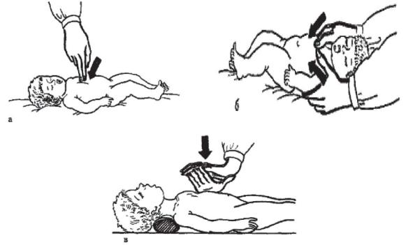 Рисунок 50 - Проведение непрямого массажа сердца новорожденному (а, б) и ребенку старшего возраста (в)
