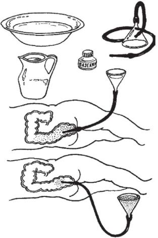 внесколько приемов вводят в прямую кишку от 5 до 10 л чистой воды, подогретой до 37-38°С, либо дезинфицирующей жидкости (слабый раствор перманганата калия, раствор гидрокарбоната натрия). Смазанный вазелином конец трубки вводят через анальное отверстие