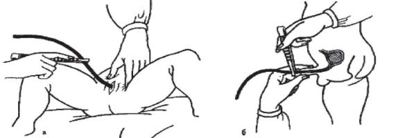 Рисунок 56 - Катетеризация мочевого пузыря у девочки (а) и мальчика (б)