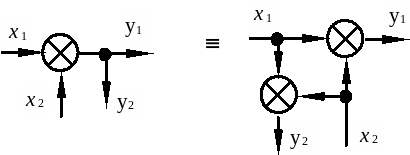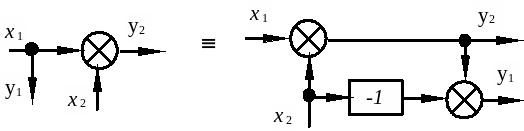 8. При переносе сумматора через узел по направлению прохождения сигнала, в переносимую цепь необходимо добавить линию связи между боковыми ветвями, направленную против хода сигнала в прямой цепи.