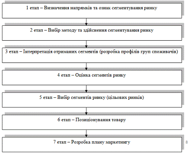 Сегментація ринку є основним методом маркетингу, за допомогою якого підприємство ділить ринок з урахуванням результатів аналізу за певними ознаками на деякі сегменти споживачів. Вона здійснюється для подальшого виділення цільових сегментів, що вимагають різного підходу в стратегії розроблення нових видів продукції, організації руху товару, реклами і стимулювання збуту [28].