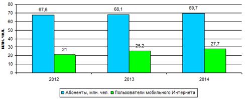 Из рис. 2.2 видно, что в 2013-2014 гг. наблюдается как рост количества абонентов, так и увеличение пользователей мобильного Интернет.