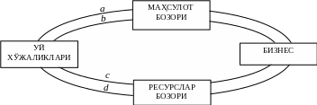 Диаграммада маҳсулот бозори, ресурслар бозори ва тўрт оқим кўрсатилган.