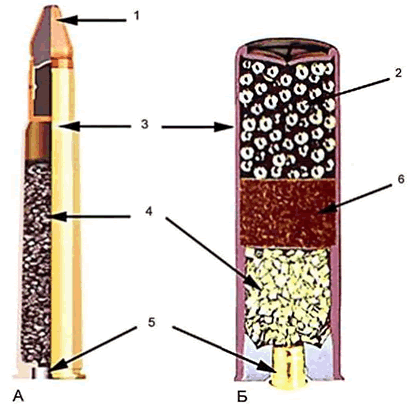 1 - пуля; 2 - дробовой заряд; 3 - гильза; 4 - метательный (пороховой) заряд; 5 - капсюль-воспламенитель; 6 – пыж