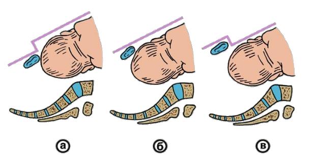 Рис. Схематическое изображение расположения головки плода по отношению к лобковому Симфизу (признак Вастена): а — признак Вастена-Генкеля положительный; б — признак Ва- стена-Генкеля«вровень»; в — признак Вастена-Генкеля отрицательный.