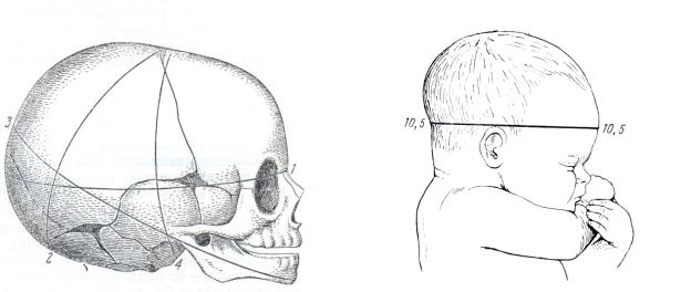 Рис.10. Череп новорожденного (вид сбоку) Рис.11.Головка новорожденного Окружности головки: 1-прямая; 2-малая Средний косой размер.