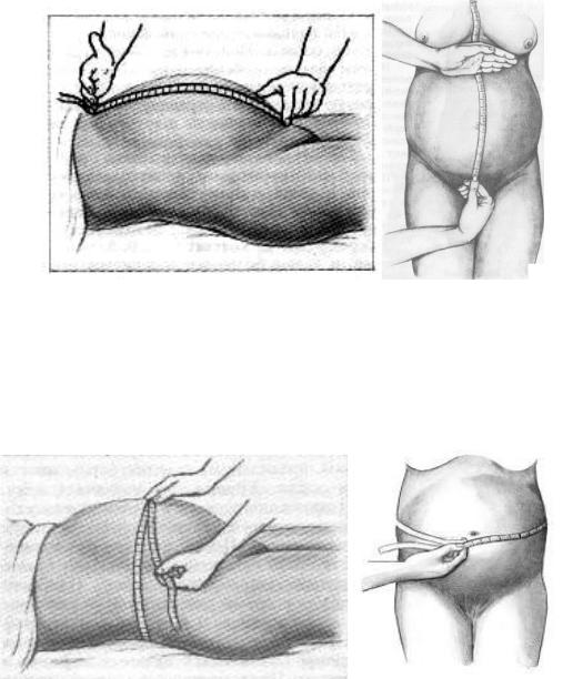 Высоту стояния дна матки определяют путем измерения сантиметровой лентой расстояния между верхним краем лобкового симфиза и наиболее высокой точкой дна матки (рис. 2). Измерение производят в положении женщины лежа на спине с выпрямленными ногами; мочевой пузырь перед исследованием должен быть опорожнен.