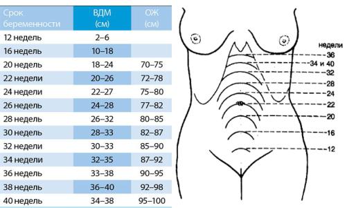 В28 недель - дно матки определяется на 2-3 пальца выше пупка (на 24-26 см выше лона). В 32 недели - дно матки стоит посередине между пупком и мечевидным отростком. Пупок начинает сглаживаться. Окружность живота на уровне пупка 80-85 см (28-30 см над лоном). В 36 недель - дно матки поднимается до мечевидного отростка и реберных дуг – это наивысший уровень стояния дна беременной матки. Окружность живота в среднем 90 см. Пупок сглажен (34-36 см над лоном). В 40 недель - дно матки опускается до уровня, на котором оно находилось в 32 недели, т.е. до середины расстояния между пупком и мечевидным отростком. Пупок выпячивается. Окружность живота 9598 см, головка опускается у первородящих и прижимается ко входу в таз или стоит малым сегментом во входе в таз (34-35 см над лоном). При одинаковом уровне стояния дна матки в 32 и 40 недель срок беременности