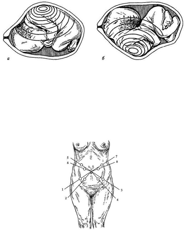 первая позиция, задний вид; 8 — тазовое предлежание, первая позиция, передний вид