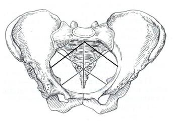 Рис.28. Основание малого сегмента во входе в таз. Опознавательные ориентиры при наружном исследовании.