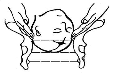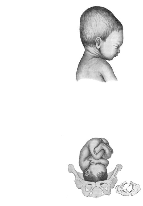 Наружные ориентиры при завершении фазы приспособления будут следующие: с одной стороны ближе к лону будут определяться лобные бугры, а с другой стороны дальше от средней линии – затылочный бугор. Оба ориентира будут определяться на одном уровне или близко к одному уровню.