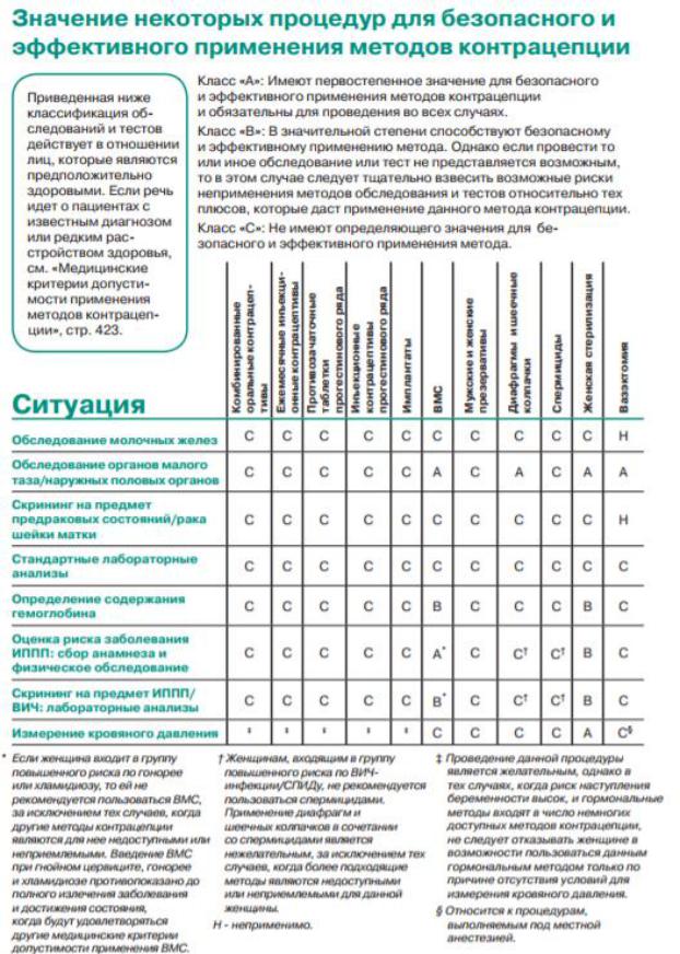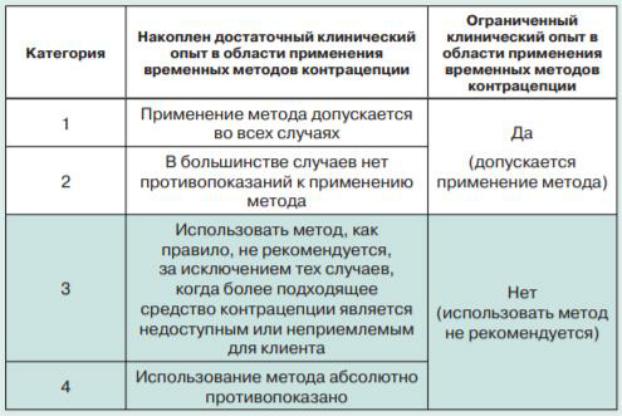 Ниже приводится сводная таблица медицинских критериев допустимости применения методов контрацепции, принятых Всемирной организацией здравоохранения.