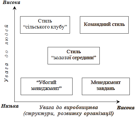 Невтручання. Йому властивий низький рівень турботи про виробництво і людей. Керівник, що сповідує такий стиль, не керує, а сам багато працює, докладає мінімальних зусиль для того, щоб зберегти своє місце в організації. Цей стиль характеризують як "зубожіння" керівництва. При цьому докладання мінімальних зусиль для виконання роботи відповідає цілям збереження належності до організації. Стиль керівництва "сільським клубом". Характеризує його високий рівень турботи про людей і низький - про виробництво, прагнення до встановлення дружніх стосунків, зручного режиму роботи тощо. Досягнення конкретних результатів керівника цікавить значно менше. Стиль "керівництво завданнями". В основі цього стилю максимальна турбота керівника про виробництво поєднана з мінімальною турботою про людей. Керівник дбає здебільшого про максимізацію показників шляхом реалізації наданих повноважень і встановлення контролю за діяльністю підлеглих, диктуючи їм свою волю. За таких умов ефективність діяльності організації від підлеглих майже не залежить. Стиль "золотої середини". Керівник, який сповідує його, прагне поєднати орієнтацію як на завдання, так і на підлеглих та їхні інтереси. Командний стиль. Його характеризують прагнення керівника поєднати в своїй діяльності інтерес до успіху виробництва й увагу до потреб людей. Такий стиль, на думку авторів моделі, є найефективнішим. При цьому досягнення цілей організації забезпечується зусиллями відданих спільній справі працівників, створюється система участі всіх членів організації у виробленні мети діяльності організації, що забезпечує атмосферу поваги, довіри та відповідальності.