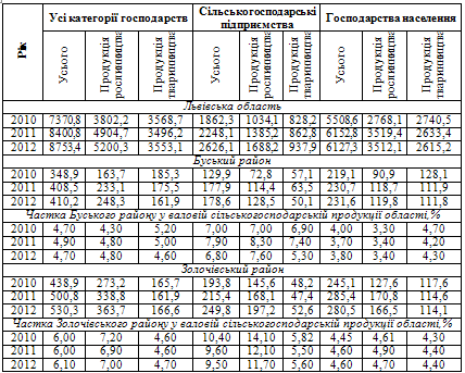 У 2013 р. збережені позитивні тенденції нарощення обсягів виробництва продукції сільського господарства. Сільськогосподарську галузь району представляють 72 підприємства та 13674 особистих підсобних господарств населення. За попередніми даними виробництво валової сільськогосподарської продукції за 2013 р. складає 583,0 млн. грн., що на 9,9% більше ніж у 2012 р. Структура виробництва продукції рослинництва і тваринництва у 2010-2012рр. у Львівській обл. зображена у таблиці 2.1.