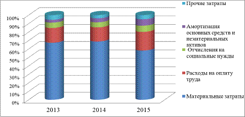 составляют материальные затраты (69,1 % в 2015 году и 72,0 % в 2014 год