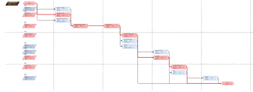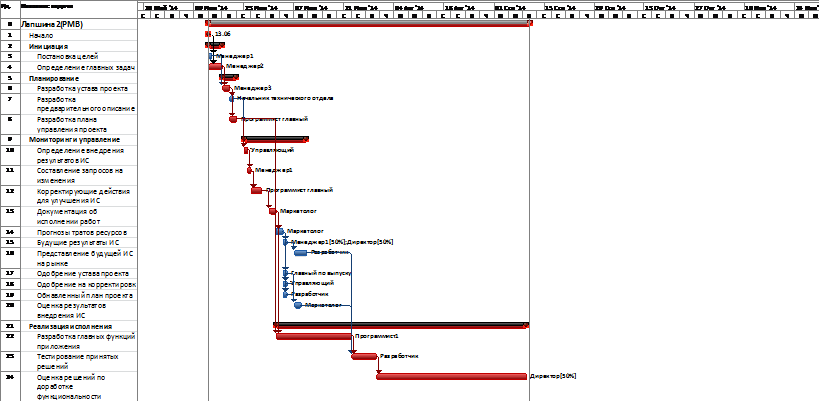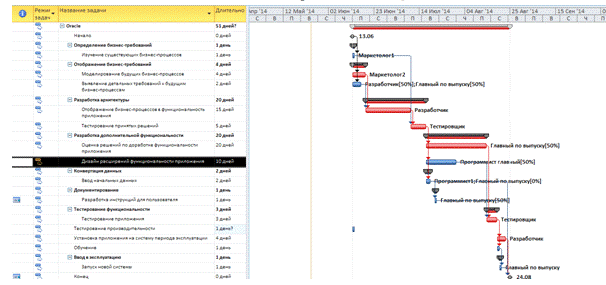 Потом следуют три этапа параллельных работ. В связки отдельные работы представляют результат, от которого зависит дальнейшее состояние проекта. Первый этап включает в себя: оценка решений по доработке, дизайн расширения функциональности, ввод начальных данных. Второй: разработка инструкций, тестирование. И третий этап состоит из: установка приложения и обучения. В каждой связке работы выполняют разные люди.