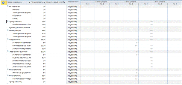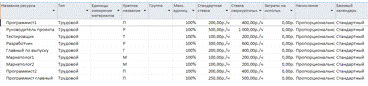 Например, первую работы выполняет Маркетолог1. Для выявление детальных требований требуются 2 человека со ставкой 50%: Разработчик и Главный по выпуску. Каждая работа имеет свои ресурсы.