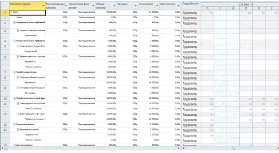 В таблице затрат можно увидеть уже посчитанные затраченные средства на весь проект, а так же на отдельную задачу. На весь проект необходимо 91 600 рублей. На этап Отображение бизнес-процессов - 7 200 рублей, из которых 3 200 рублей уходят на моделирование и 3 000 рублей на выявление требований и так далее.