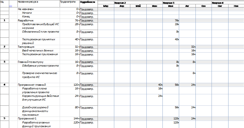 какие работы выполняет каждый ресурс. Так же представлено количество часов, как