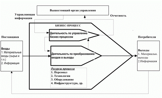 В рамках процессного подхода любое предприятие рассматривается как бизнес-система, которая представляет собой связанное множество бизнес-процессов, конечными целями которых является выпуск продукции или услуг. М.Хаммер и ДжЛампи определяют бизнес-процесс «как совокупность различных видов деятельности, в рамках которой «на входе» используются один или более видов ресурсов, и в результате этой деятельности на «выходе» создается продукт, представляющий ценность для потребителя».