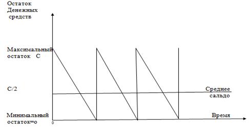 В западной практике наибольшее распространение получили модели: первая была разработана В. Баумолем в 1952 г., а вторая - М. Миллером и Д. Орром в 1966 г. Модель Баумоля предполагает, что предприятие начинает работать имея целесообразный для него уровень денежных средств, затем постоянно расходует их в течении некоторого периода времени.