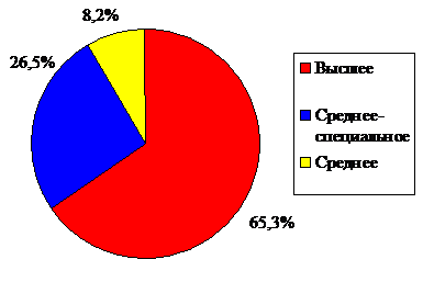 Из рис. 5 видно, что большая часть работников школы имеет высшее образование (65,3%), средне-специальное образование имеет 26,5% работников. Работников со средним образованием меньше всего (8,2%).