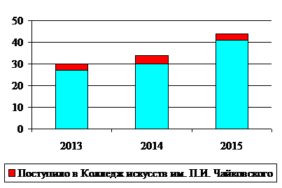 В 2013 г. МАУ ДО «Детскую школу искусств №5» окончили 30 чел., из них 3 поступили в ГАПОУ РБ «Колледж искусств им. П.И. Чайковского» (10% от общего числа выпускников), в 2014 г. - 4 из 34 выпускников поступили в колледж (11,8%), а в 2015 г. - 3 из 44 чел. (6,8%). Таким образом, число выпускников детской школы искусств, продолжающих обучение в профессиональных образовательных учреждениях сферы культуры и искусства в 2013-2015 гг. не изменилось в абсолютном выражении (3-4 чел. в год), но при этом снизилось в относительном выражении (с 10% до 6,8%).