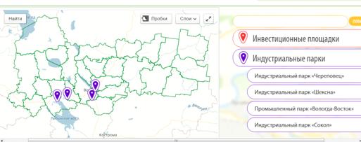 Инвестиционную карту Вологодской области в отличие от аналогичной карты Ярославской области нельзя назвать информативной. Здесь указаны только индустриальные парки на территории области. Такая карта не может заинтересовать потенциального инвестора ввиду неполноты представленной информации. Для повышения уровня инвестиционной деятельности карту необходимо разнообразить, дополнить возможностью интерактивного выбора настроек отображения данных.