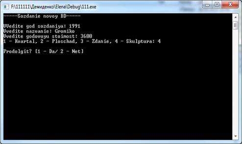 } while ( !((i>0)&&(i<5)) ) ;(i==1) prod.addVid(z1.getVid());(i==2) prod.addVid(z2.getVid());(i==3) prod.addVid(z3.getVid());(i==4) prod.addVid(z4.getVid());= new Pamyatniki (g, n, gc, i);.push_back(*tek);++;<< "\nProdolgit? [1 - Da/ 2 - Net] " ;>> ans;(ans==2) break;