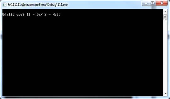 Для того чтобы удалить данные из таблицы необходимо выбрать четвертый пункт меню - «Ydalenie vsex dannyx». После выбора этого пункта пользователю будет задан вопрос: представленный на рисунке 2.13 и вся информация из файла будет удалена. Это можно увидеть, выбрав пункт «5 - Prosmotr dannyx», рисунок 2.14.