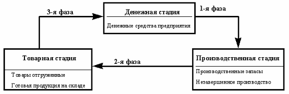 Кругооборот денежных средств (рис. 1) начинается с момента оплаты предприятием материальных и других ресурсов, необходимых производству, и заканчивается возвратом этих затрат в составе выручки от реализации продукции. Затем денежные средства вновь используются предприятием для приобретения материальных ресурсов и очередного запуска их в производство. Тем самым обусловливается непрерывное возобновление процесса производства. В результате оборотные средства постоянно находятся в движении, совершая кругооборот. Закупки приводят к увеличению производственных запасов и кредиторской задолженности, производство ведет к росту готовой продукции, реализации - к росту дебиторской задолженности и денежных средств в кассе и на расчетном счете. Таким образом, в своем движении оборотные средства, изменяя форму, проходят последовательно три стадии кругооборота: денежную стадию, производственную стадию, стадию обращения. Для обеспечения непрерывности производства на любом предприятии оборотные средства должны находиться в любой момент в каждой из трех стадий кругооборота.