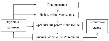 включает в себя подбор (привлечение, отбор, наем), вознаграждение, оценку