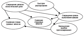 Концепция логистики быстрого реагирования создает общую основу для объединения различных потоков в глобальную информационную логистическую систему, обеспечивающую высокую скорость реакции. Ускорение процессов в такой системе сокращает кумулятивные сроки выполнения заказа потребителя, что ведет к сокращению запасов продукции, а это, в свою очередь, вызывает дальнейшие поиски средств и методов сокращения сроков выполнения заказа. Таким образом, система быстрого реагирования образует замкнутый контур взаимосвязи двух ключевых понятий логистики- "время - запасы". Эта система изображена на рисунке 1.2.