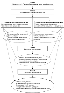 Первый этап цикла объективно необходим, что связано с постоянным усложнением создаваемой техники и повышением наукоемкости промышленной продукции. При определении эффективности первого этапа цикла в конкретной отрасли необходимо учитывать различия в уровне наукоемкости соответствующего производства. Таким образом, первый этап напрямую связан с понятием наукоемкости продукции, определяемой как отношение затрат на НИОКР и фонда освоения новой техники к реализованной (товарной) продукции. Показатель наукоемкости имеет индексную форму, т. е. не зависит от курса валют, что допускает сравнение его величин при проведении технико-экономического анализа конкурентоспособности изделий отечественного и зарубежного производства. Для каждой отрасли имеется определенный уровень (индекс) наукоемкости. Существуют группы отраслей промышленности с высокими (например, химическая, электротехническая, специальное машиностроение, производство транспортного оборудования), средними (цветная металлургия, нефтехимическая, бумажная) и низкими (черная металлургия, пищевая, текстильная, деревообрабатывающая) показателями наукоемкости.