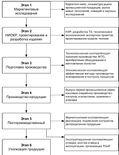 Все эти процессы требуют больших затрат времени, ресурсов и осуществляются силами заводов-изготовителей с привлечением разработчиков. Началом этапа при плановой государственной экономике считалось получение разрешения на серийный выпуск, а окончанием - выпуск первой промышленной серии (партии) продукции данного вида. Именно в силу затратности и трудоемкости освоение и подготовка производства новой продукции является самостоятельным этапом ЖЦ. Этот этап обладает специфическими особенностями, отличающими его от этапа разработки и серийного производства. В то же время он занимает промежуточное положение между разработкой продукции и ее серийным производством и имеет ряд общих черт с обоими смежными этапами