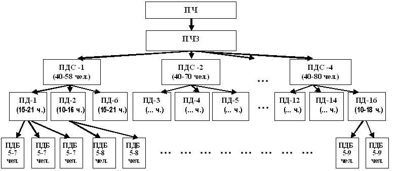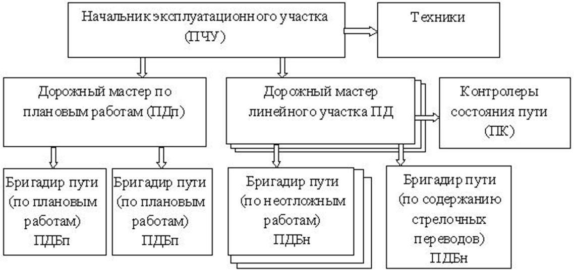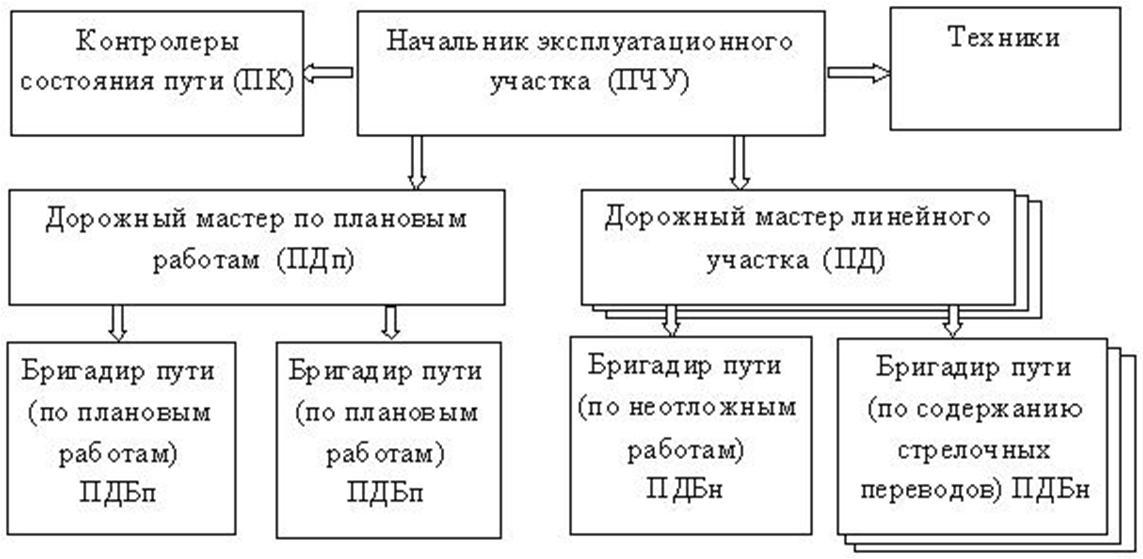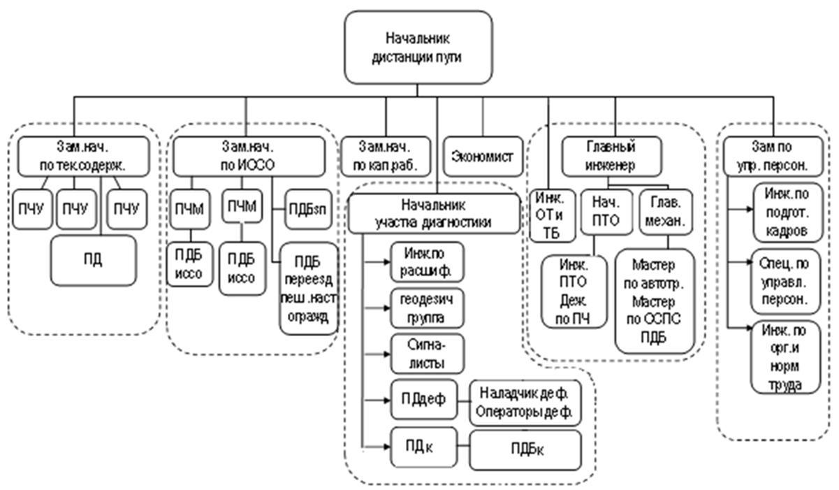Организационная структура участков околоточного типа представляет собой деление участков дистанции пути на околотки, возглавляемые дорожными мастерами (ПД), а околотков - на рабочие отделения численностью 5-9 чел., которыми руководят бригадиры пути (ПДБ).