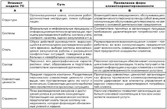Различные проявления клиентоориентированности требуют систематизации, в качестве ключевого критерия предлагается использовать понятие формы ее реализации. Под формой клиентоориентированности понимается система ее проявлений, в которой выделяются виды, уровни и подсистемы, связанные между собой. Совокупность проявлений клиентоориентированности уместно рассматривать в рамках модели Мак-Кинси "7С" (Таблица 2), в соответствии с которой организация как объект управления в процессе управленческого воздействия формирует собственные характеристики.