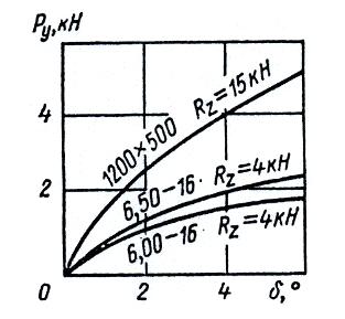 Экспериментальные зависимости угла δ от Ру для некоторых шин показаны на рисунке 2.2. Эти зависимости имеют сложный характер, однако при малых углах увода их можно приближенно считать линейными, а коэффициент kу постоянным.