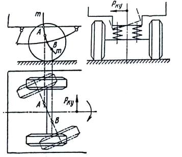 Креновая поворачиваемость автомобиля связана с конструкцией его подвески. На рисунке 2.5 показан задний мост с рессорной подвеской автомобиля, который совершает правый поворот. Передние концы рессор соединены с кузовом простым шарниром, а задние - с помощью серьги. При прогибах рессоры задний мост перемещается по дуге mm, причем ось его качания расположена около шарнира. Под действием поперечной силы Рку кузов автомобиля наклоняется, вызывая сжатие левых рессор и распрямление правых. Левая рессора, сжимаясь, перемещает задний мост назад (в точку А), а правая, распрямляясь, перемещает его вперед (в точку В). В результате задний мост поворачивается в горизонтальной плоскости, как показано штриховой линией.