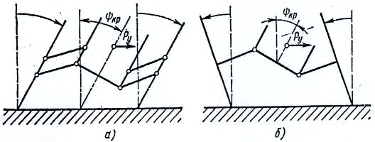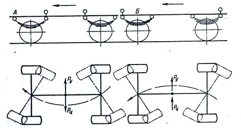 наклоняются в сторону крена кузова в направлении действия поперечной силы Ру,