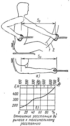 Место расположения рычага переключения передач зависит, от усилия, необходимого для его перемещения. Вследствие этого рычаг следует располагать в оптимальной зоне рабочих движений водителя. Рукоятку стояночного тормоза размещают в этой же зоне с учетом усилия, прикладываемого к ней. Зависимость развиваемого водителем усилия от места расположения рычага показана на рисунке 4.2.