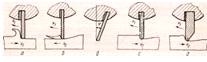 Значение отдельных элементов ножа в процессе резания видно из следующего: острие изменяется в наибольшей степени в связи с износом - затуплением и изгибанием, вследствие чего изменяется как мощность резания, так и характер обработки. Грани при этом остаются почти нетронутыми. Однако длина граней влияет как на быстроту износа острия, так и на механизм процесса резания, а следовательно, и характер и качество обработки. В зависимости от характера обработки ножи затачиваются по-разному (рис1.5).