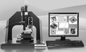 В то же время высокая изгибная жесткость консоли зонда позволяет острию зонда проникать сквозь вязкий слой до контакта с упругой поверхностью, а также модифицировать поверхность -проводить индентирование и нанесение царапин (склерометрия). Конструкция зонда допускает использование алмазных наконечников различных типов и размеров. Изгиб пьезорезонансного зонда контролируется с помощью высокоточного датчика перемещений, позволяющего измерять силу нагружения в процессе наноиндентирования.