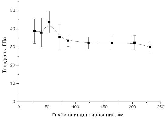 Физический анализ пленок TiN на твердомере «НаноСкан3D» выявил многофазный состав при различных условиях осаждения. Это, вероятно, связано с конденсацией оксида титана во время роста покрытия. Структурные вакансии из монооксида титана упрочняют нитридтитановую матрицу и повышает эффективность покрытия. Из рисунка 4.8 видно, что на глубине 60 нм покрытие имеет твердость до 50 ГПа. Это говорит о том, что в этом месте имеется фаза из монооксида титана.