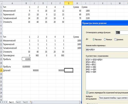 Решение данной задачи будем проводить в ms excel, был выбран симплекс-метод. Заполняем ячейки в таблицах данными из условия, определяем нужные нам параметры для поиска, чтобы выявить зависимости. После открываем надстройку поиска решений, в ней указываем изменяемые данные, дополнительные условия из задачи и жмем найти. Подробное описание таблиц с данными и использование надстройки поиск решений представлено на рисунке 1. После получения результатом можно сделать вывод, чтобы получить максимальную прибыль от производства, нужно изготовить изделий под номером 2 и номером 5 по 900 тысяч штук, при таком раскладе прибыль будет составлять 81 миллион рублей.