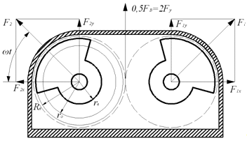 Для устранения действия горизонтальной составляющей возмущающей силы применяются вибраторы с направленным действием возмущающей силы. Простейшим вибратором такого типа является двухвальный вибратор. Валы, на которых установлены дебаланса, соединены зубчатыми колесами и вращаются в противоположные стороны с одинаковой угловой скоростью. При этом горизонтальные составляющие возмущающей силы Fх (если равны массы дебалансов) всегда будут равны по величине, но противоположны по направлению, следовательно, они будут взаимно уравновешивать одна другую. Вертикальные составляющие возмущающей силы также будут иметь одинаковую величину, но в противоположность горизонтальным их направление будет совпадать. Вследствие этого вибратор получает направленное действие сил инерции, причем линия действия всегда будет перпендикулярна к прямой, соединяющей геометрические центры валов дебалансов.
