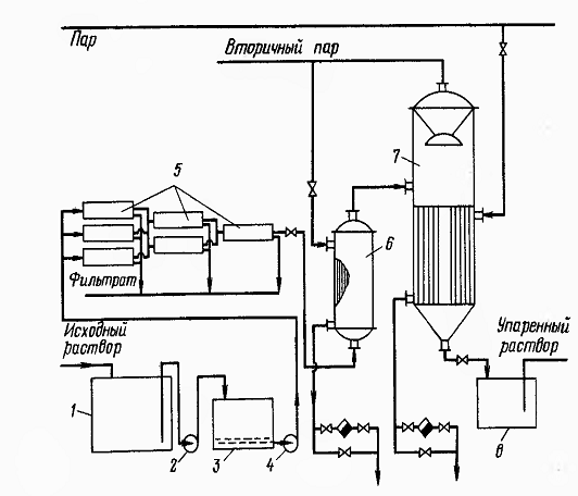 Вторичный пар из выпарного аппарата 7 направляется для обогрева других