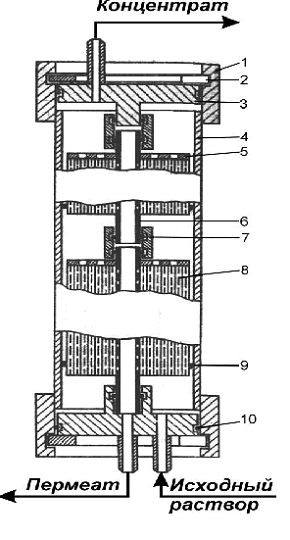 Исходный раствор через штуцер поступает в аппарат и проходит через витки модуля (напорные каналы) в осевом направлении. Последовательно проходя все модули, раствор концентрируется и удаляется из аппарата через штуцер отвода концентрата. Прошедший через мембраны пермеат транспортируется по дренажному слою к пермеатоотводящей трубке, проходит через отверстия в ее стенке и внутри трубки движется к выходному Штуцеру. . :