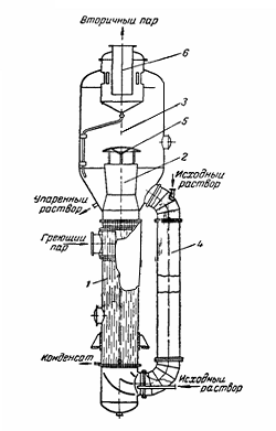 Циркулирующий раствор опускается по наружной не обогреваемой трубе 4. Упаренный раствор отводится из кармана в нижней части сепаратора 3. Вторичный пар, пройдя отбойник 5 и брызгоуловитель 6, удаляется сверху аппарата. Исходный раствор поступает либо в нижнюю часть аппарата (под трубную решетку нагревательной камеры), либо сверху в циркуляционную трубу 4.
