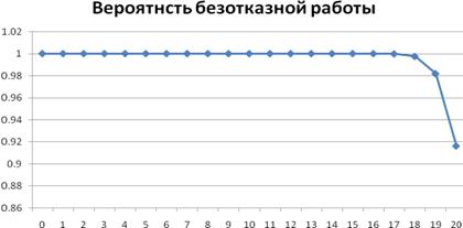 Среднее время безотказной работы системы T1 равно математическому ожиданию m, т. е. T1 = 26,38 час.